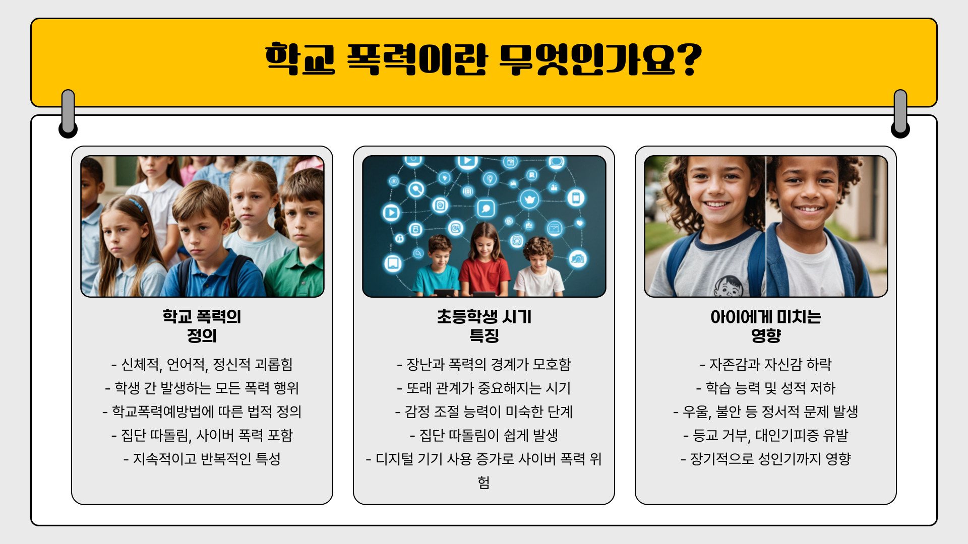 학교 폭력은 아이의 자존감과 학습 능력에 큰 영향을 미칠 수 있으므로 조기 발견과 예방이 중요합니다.